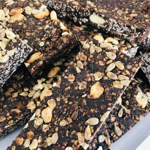 Unsere selbsthergestellten, gesunden Schoko-Powerriegel sind vegan und zuckerfrei.